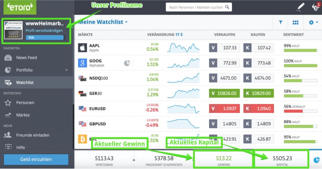 Nachdem man einige erfolgreiche Trader kopiert hat, kann man sein investment beobachten.